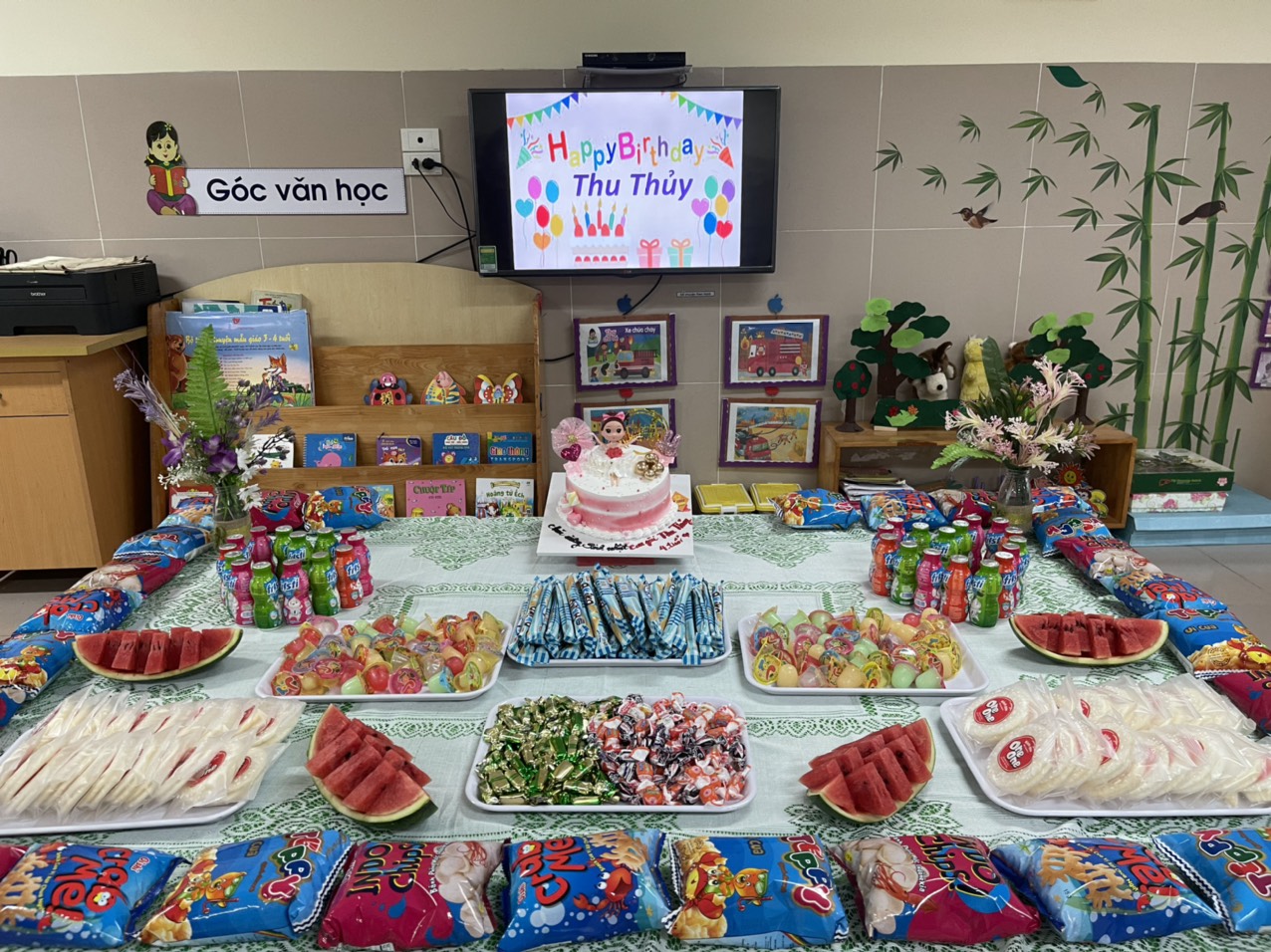 Hôm nay là sinh nhật của bạn Lê Thu Thủy , bạn rất vui vì được cô giáo, các bạn và ba mẹ tổ chức mừng sinh nhật 4 tuổi ở tại lớp học. Đây là kỷ niệm thật đáng nhớ của bạn vì bạn nhận được những lời chúc từ cô giáo và các bạn: chúc Thu Thủy thêm một tuổi luôn mạnh khỏe, ngoan ngoãn và hay ăn chóng lớn!