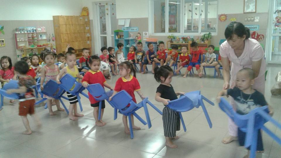 Sau khi kết thúc giờ học, các bạn nhỏ xếp hàng cất ghế để chuẩn bị cho hoạt động tiếp theo trong ngày.