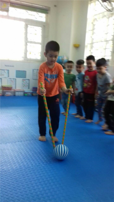 Cách chơi trò chơi này như sau: Mỗi trẻ sẽ sử dụng 2 chiếc gậy (Mỗi tay cầm 1 chiếc gậy) sau đó dùng dậy di chuyển bóng theo hướng thẳng về đích. Trò chơi này đã giúp các bạn nhỏ phát triển khả năng phối hợp giữa mắt, tay và chân; phát triển sự định hướng không gian và khả năng khéo léo của bản thân. Làm sao để có thể di chuyển bóng về đích theo hướng thẳng mà không để bóng ra khỏi vị trí của đôi gậy mà các con đang điều khiển trên tay.