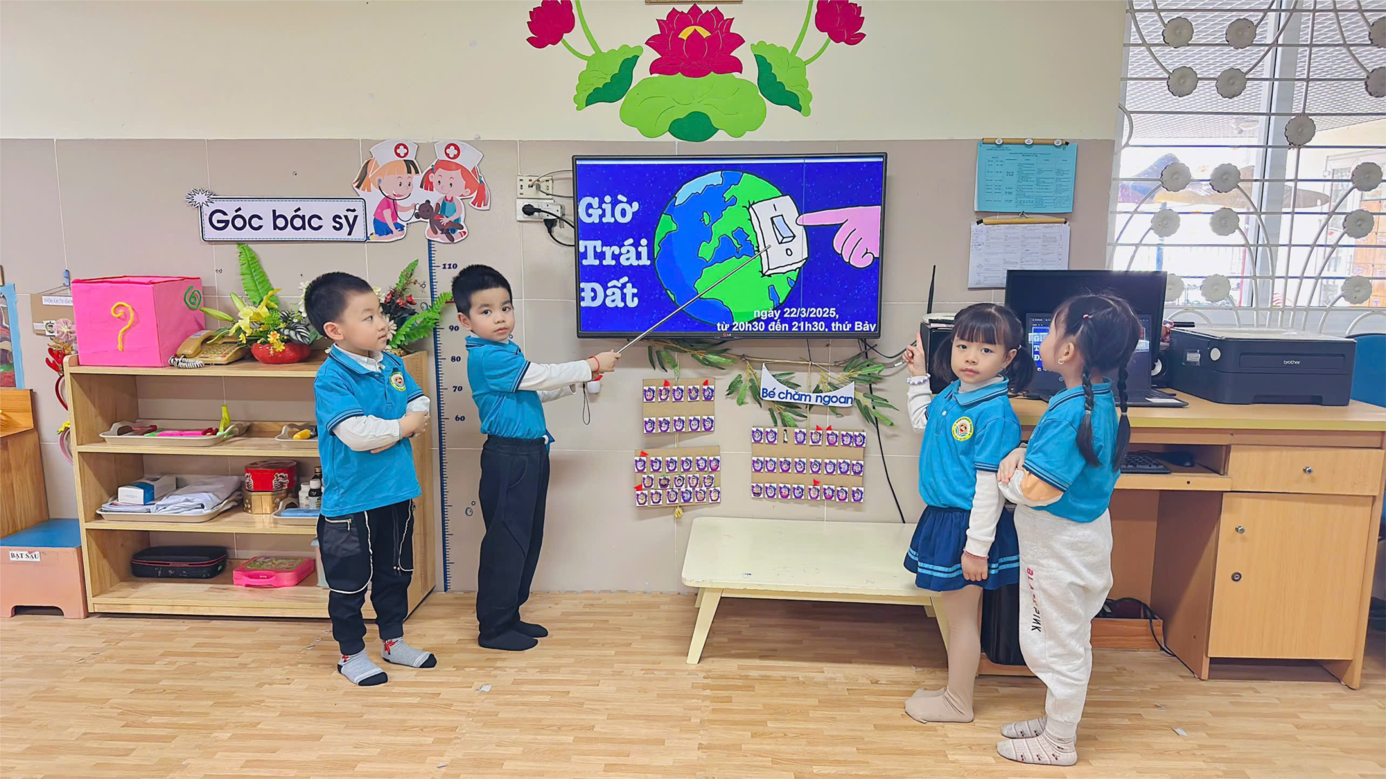 Lớp mẫu giáo lớn A2 đã có buổi trò chuyện, tìm hiểu về Giờ trái đất. Các bé được cùng nhau trao đổi để biết được ý nghĩa cũng như việc tuyên truyền nâng cao ý thức bảo vệ môi trường.