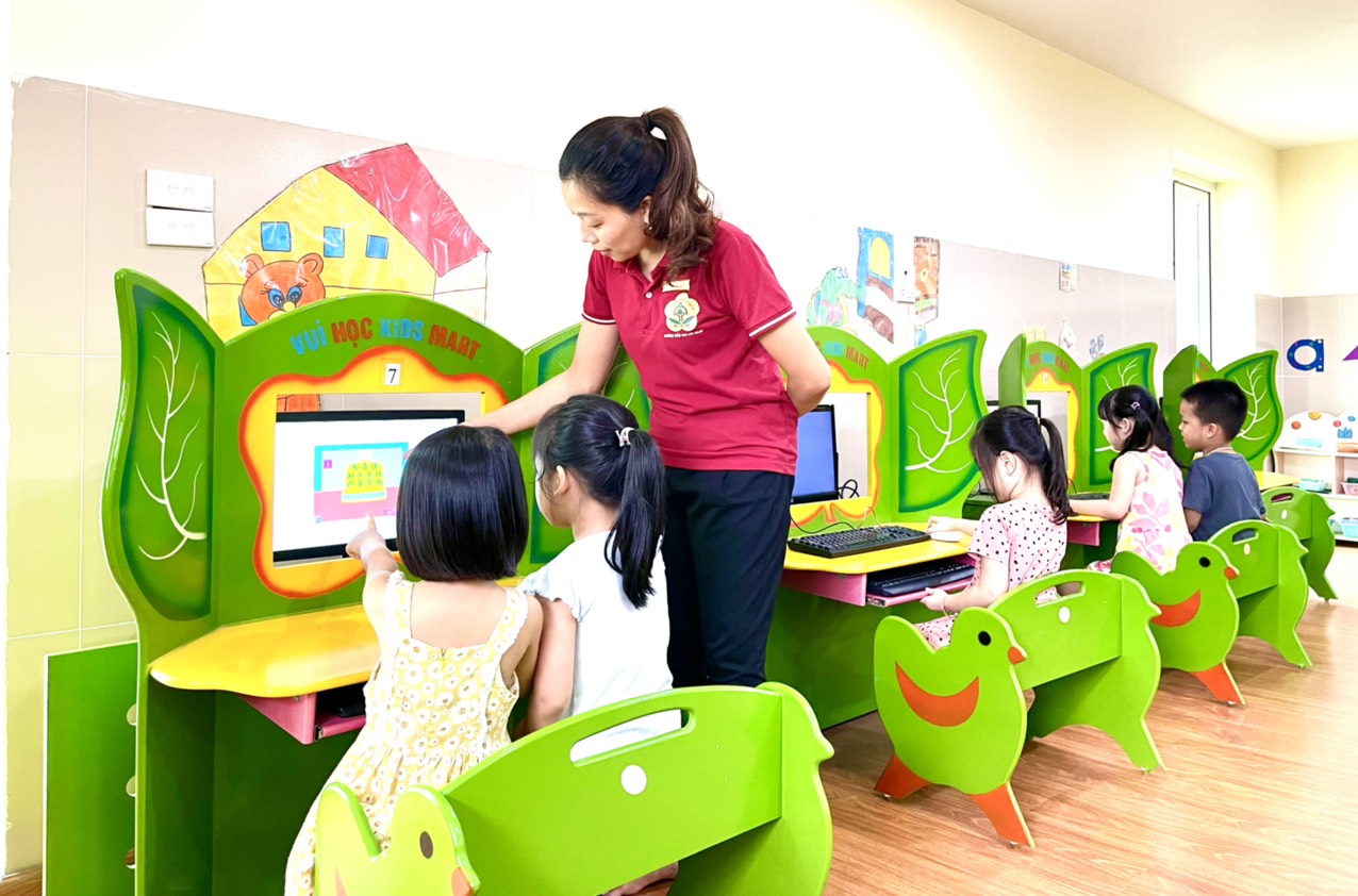Cuối tuổi Mầm non,trẻ mẫu giáo Lá vẫn gắn liền hoạt động chủ đạo “Học mà chơi, chơi mà học”. Sự đổi mới không ngừng của nội dung, phương pháp, hình thức chương trình giảng dạy đã giúp trẻ từ thế hoạtđộng thụ động sang thế chủ động rỏ nét, phát huy mạnh mẽ năng lực của từng cá nhân cũng như tính tích cực, năng động theo từng mức độ trẻ làm cho mỗi giờ hoạt động trở nên lý thú, nhiều bất ngờ, trẻ tích lũy nhiều kiến thức, kỷ năng. Trong những năm học vừa qua cô và trẻ được tiếp nhận thêm một chương trình mới là những trò chơi hấp dẫn trên máy tính của chương trình Kidsmart. Qua thời gian học tập nghiên cứu và vận dụng vào các giờ hoạt động của trẻ đã đem đến nhiều hiệu quả khi trẻ tham gia hoạt động, nhất là hình thức vận dụng và sáng tạo trò chơi từ chương trình gốc trên máy tính được gắn kết vào tất cả các hoạt động chơi, học của trẻ. Các bé lớp MGL A5 được thực hành chơi các trò chơi trên phần mềm Kidmart rất hào hứng và say sưa: