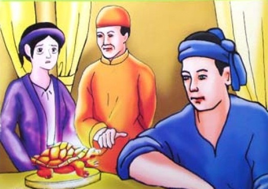 Nhà Đại trượng phu đồ đạc chẳng thiếu vật gì, một hôm lấy 5 làng vàng đưa cho thợ kim hoàn làm một con rùa để trưng bày. Gặp lúc Chí quân tử lại chơi, Đại trượng ohu đem rùa vàng mới đúc ra khoe với bạn. Xem rồi để trong cái đĩa, 2 người ngồi uống rượu nói chuyện, uống mãi say nằm ngủ quên đi. Con trai của Đại trượng phu đi học xa về thăm nhà, thấy con rùa lấy đem đi chơi. Đến khi 2 người tỉnh dậy quên lửng con rùa vàng. Chí quân tử từ giã bạn ra về, một lúc Đại trượng phu nhớ đến con rùa vàng, hỏi vợ, vợ nói không cất, mới chẳng biết tính sao, không lẽ nghi cho bạn là người có bụng tốt đã lấy đi.