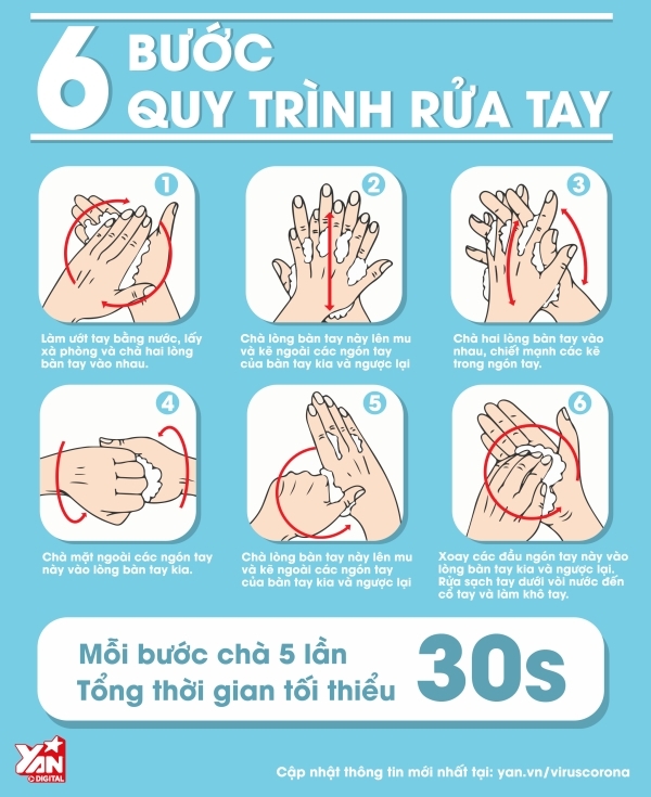 Bước 6: Xả cho tay sạch hết xà phòng dưới nguồn nước sạch. Lau khô tay bằng khăn hoặc giấy sạch.