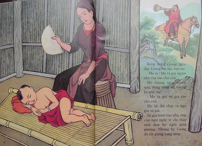 Bấy giờ có giặc Ân đến xâm phạm bờ cõi nước ta. Thế giặc mạnh, nhà vua lo sợ. Bèn truyền cho sứ giả đi khắp nơi tìm người tài giỏi cứu nước. Ðứa bé nghe tin, bỗng dưng cất tiếng nói: “Mẹ ra mời sứ giả vào đây”. Sứ giả vào, đứa bé bảo: “Ông về tâu vua sắm cho ta một con ngựa sắt, một cái roi sắt và một tấm áo giáp sắt, ta sẽ phá tan lũ giặc này”.