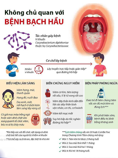 1. Đưa trẻ đi tiêm chủng tiêm vắc xin phối hợp phòng bệnh bạch hầu: ComBe Five hoặc DPT-VGB-Hib (SII), Td đầy đủ, đúng lịch.
