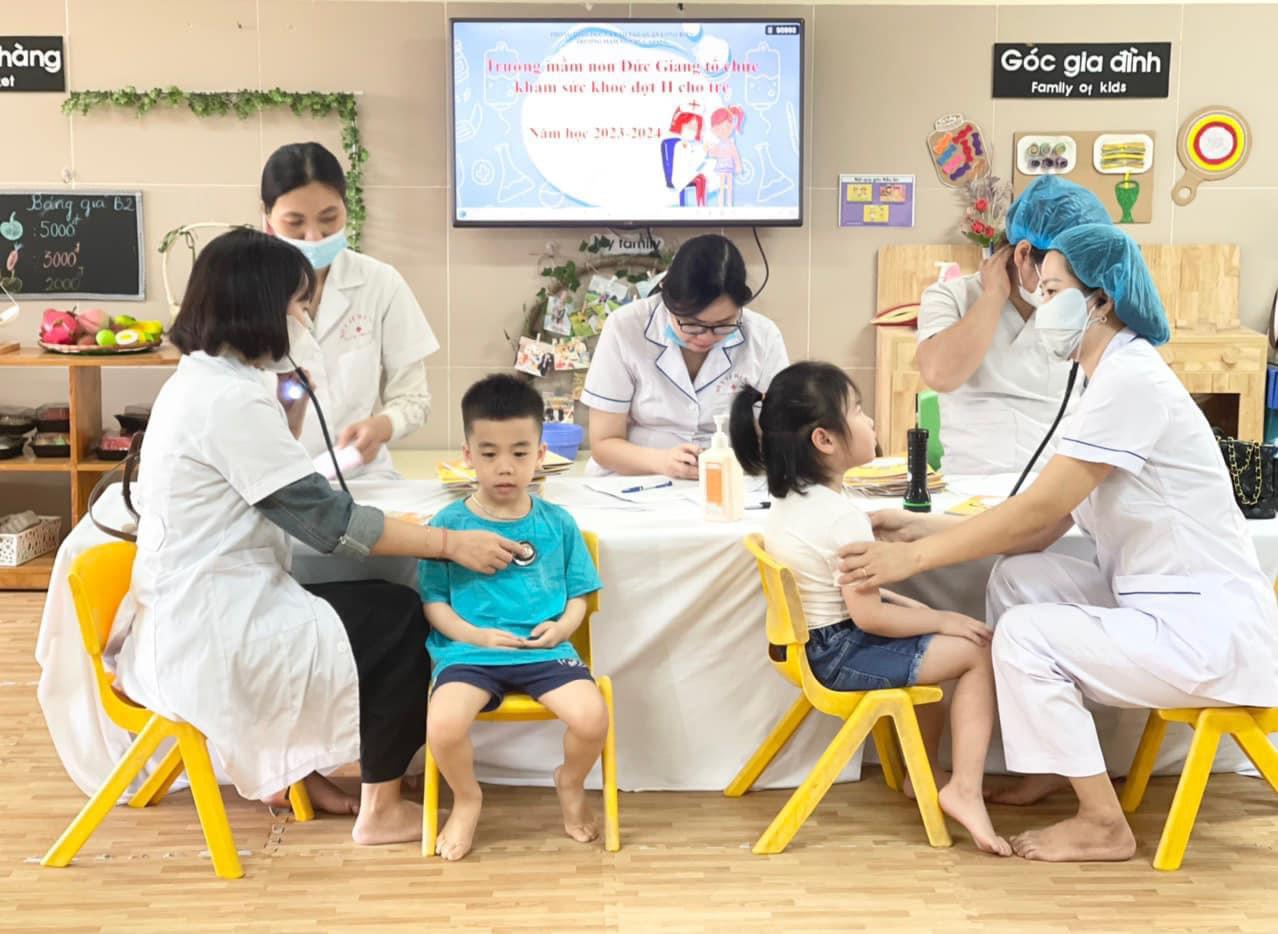 Chăm sóc sức khỏe cho trẻ là nhiệm vụ hàng đầu tại Mầm Non Đức Giang. Đi đôi với các hoạt động chăm lo bữa ăn, giấc ngủ, tăng cường các hoạt động thể lực thì việc khám sức khỏe định kì cho trẻ là việc làm thường niên hàng năm tại nhà