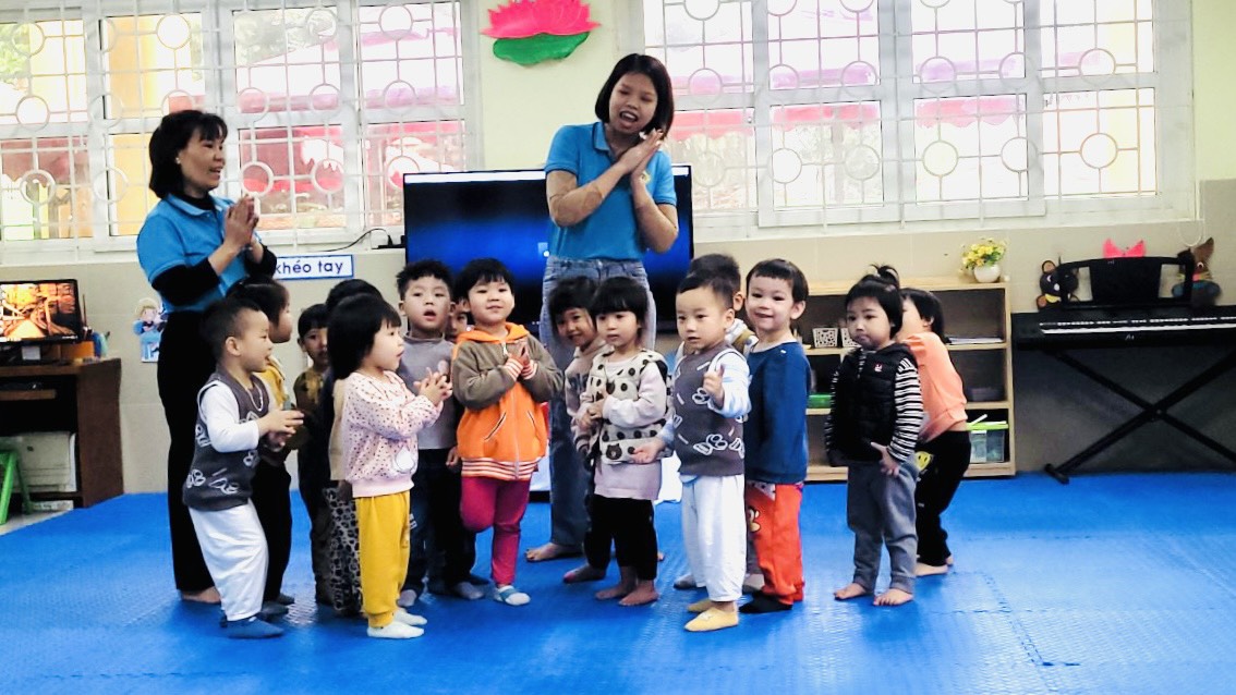 Cùng sáng thứ 5 ngày 14/3 CBGV nhà trường tiếp tục tham gia kiến tập chuyên môn chuyên đề phát triển ngôn ngữ-Nhận biết tập nói tại lớp Nhà trẻ D1 do cô giáo Nguyễn Thị Thu Hằng và cô giáo Âu Thị Hiển thực hiện .