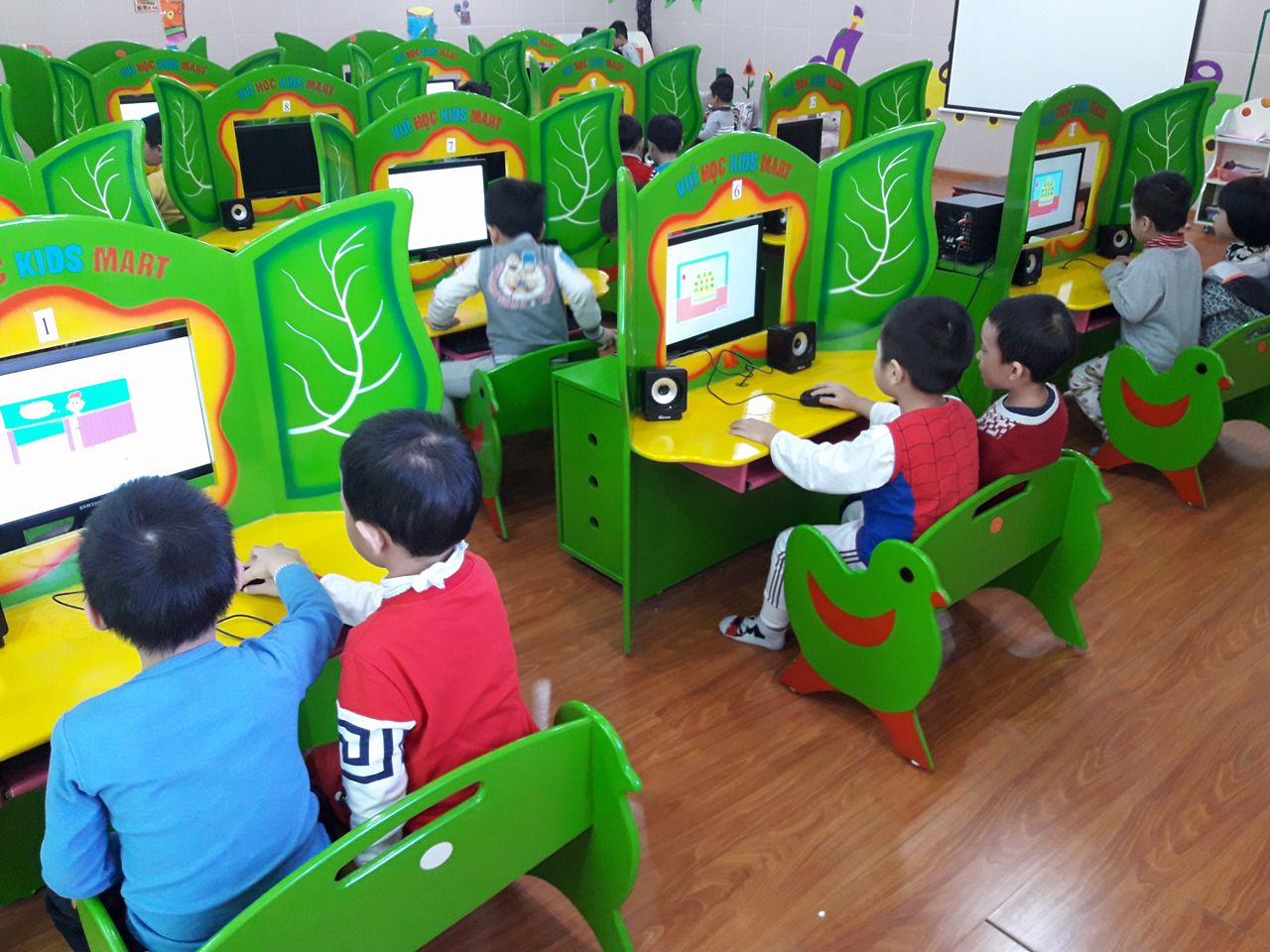 Phòng học Kidsmart được trang bị gần 20 máy tính, với không gian hiện đại, đảm bảo an toàn và vệ sinh, là nơi thu hút rất nhiều trẻ tham gia hoạt động. Hai bé 1 máy dưới sự hướng dẫn của cô giáo bé nào cũng cảm thấy hứng thú và say mê với các trò chơi phát triển trí tuệ trên máy tính. Các trò chơi Kidsmart ngoài việc phát triển tư duy, nhận thức của trẻ còn rèn luyện phản xạ tinh nhạy khi trẻ sử dụng chuột, góp phần trang bị cho trẻ 1 sự khởi đầu hiệu quả giúp cho quá trình học tập sau này. Mỗi ngày đến trường của các bé lớp B4 thực sự là một ngày vui.