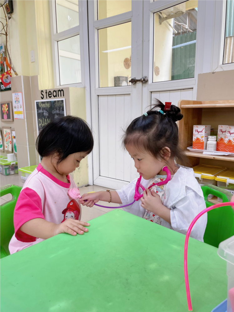 Thực hiện kế hoạch giáo dục, hàng ngày các lớp học đều tổ chức hoạt động góc . Đây là hoạt động được trẻ rất thích thú khi tham gia. Qua các góc chơi như góc lắp ghép, góc phân vai, góc nghệ thuật…trẻ được đóng vai là bác sĩ, bác đầu bếp,… được thực hiện những công việc hàng ngày của người lớn như nấu ăn, khám bệnh với những đồ chơi giống đồ vật thật, gần gũi, gắn liền với cuộc sống hàng ngày. Ngoài ra trẻ còn được lắp ghép, tô màu tranh để rèn luyện các kỹ năng vận động tinh.
