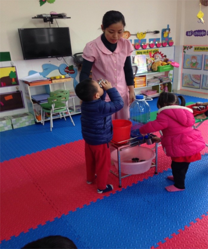 Cô hướng dẫn trẻ cách vặn vòi lấy nước