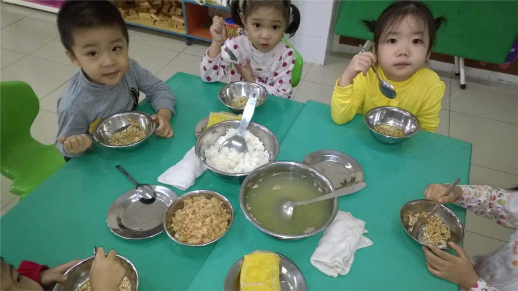 Hàng ngày, cứ đến giờ ăn cơm là các bé lại cùng nhau đọc vang bài thơ: "Giờ ăn cơm" như một lời nhắc nhở cũng như ổn định các bạn cùng ngồi vào bàn.