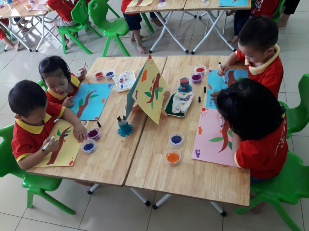 Cô cho trẻ thực hành, cho trẻ được thoải mái tự sáng tác ra tác phẩm của mình, dưới sự hướng dẫn và giúp đỡ của cô. Dưới đây là hình ảnh trong tiết học của trẻ MGB C2 trong giờ hoạt động tạo hình: