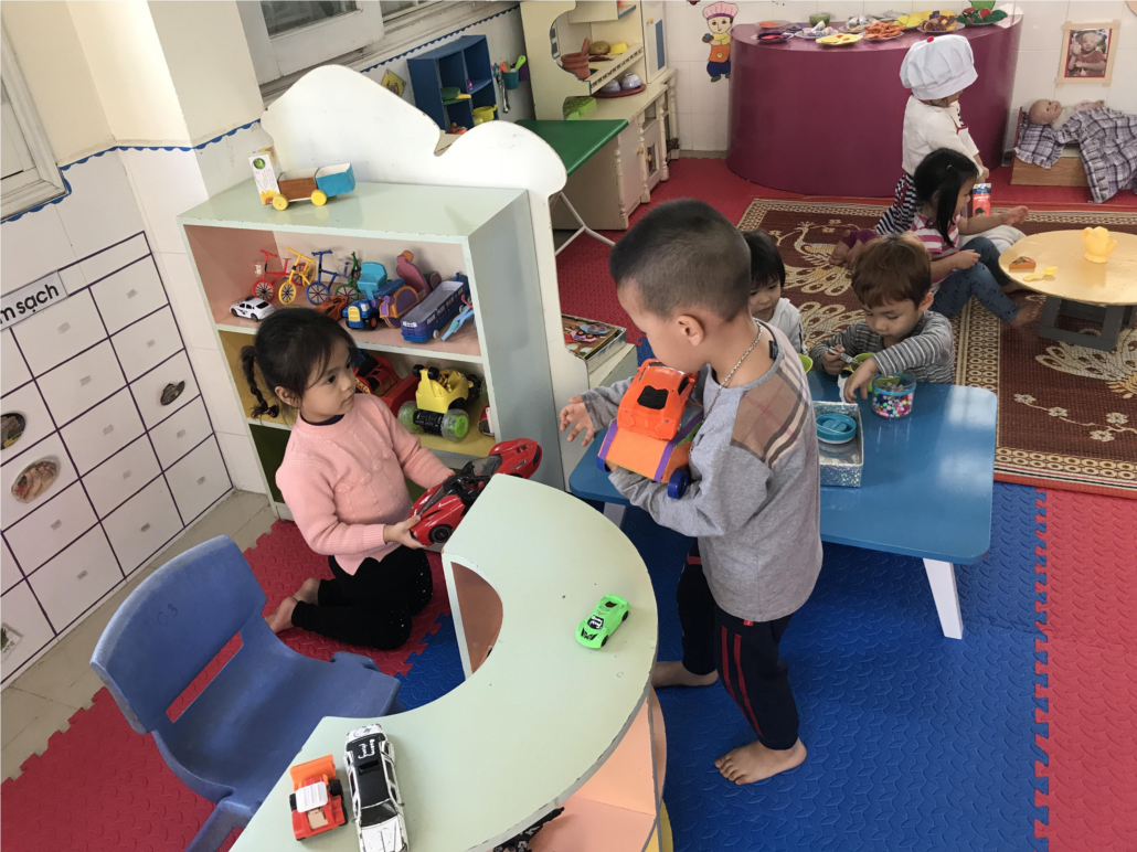 Với chủ đề sự kiện “Ô tô” - Phương tiện giao thông đường bộ, trẻ đã hóa thân thành kĩ sư xây dựng để xây dựng công trình “Bãi đỗ xe ô tô”. Ngoài ra, các trẻ còn được hóa thân vào những cô chú công nhân nhí để lắp ráp ô tô…Một số trẻ khác chơi ở 1 số góc chơi khác; góc chơi toán học, tạo hình, nhằm phát huy khả năng của mình.