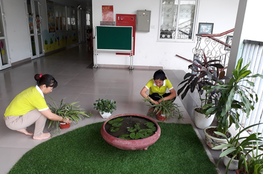 Các cô cắt, tỉa cây xanh tạo quang cảnh ,không gian cho trẻ chơi và học tập