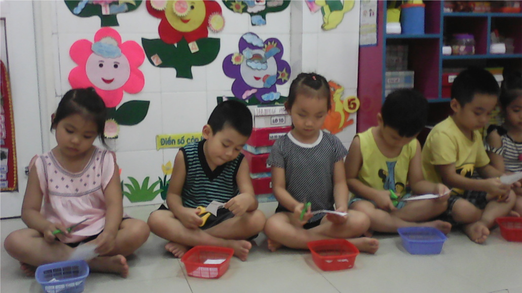 Giờ học diễn ra trong không khí thoải mái, trẻ hứng thú và tích cực hoạt động. Hầu hết các con đều có kĩ năng cầm kéo và cắt theo đường thẳng: