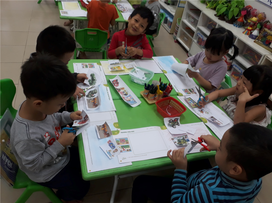 Khi nói đến việc cho trẻ sử dụng kéo, đa phần các phụ huynh đều sợ con sẽ cắt vào tay, và không cho con sử dụng. Cắt là một kỹ năng khó, nhưng các cô giáo đã mạnh dạn đưa vào trong các hoạt động học của lớp. ví dụ như tiết “Cắt các đồ dùng trong gia đình từ họa báo” Mới đầu nhiều trẻ còn lúng túng, chưa quen khi cầm kéo, nhưng sau nhiều buổi trẻ được thực hành, trẻ đã mạnh dạn hơn, phối hợp nhịp nhàng giữa các ngón tay vào kéo để có những đường cắt đẹp.