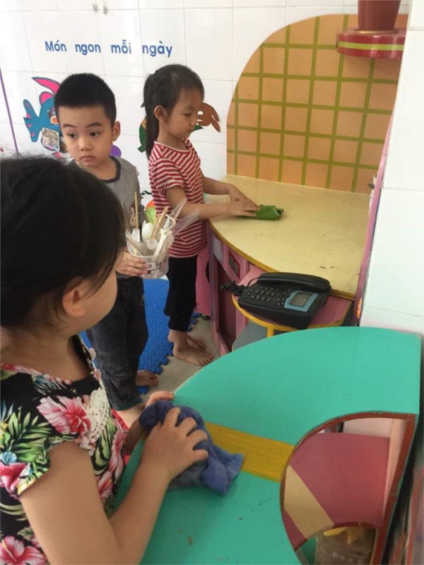 Cùng xem một số hình ảnh cô và các bé lớp A1 trực nhật dọn dẹp môi trường lớp học.