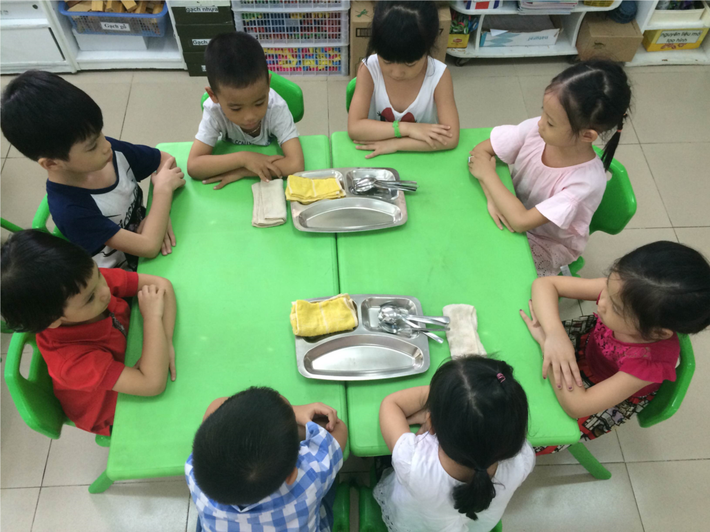 Vừa khéo léo lồng ghép hoạt động giáo dục kỹ năng tự phục vụ nhưng lại để trẻ cảm thấy thoải mái trong giờ ăn, các cô giáo lớp A3 đã để các con tự phân công nhiệm vụ trước bữa ăn. Trẻ tự giác chuẩn bị bàn ghế, tự chia đồ dùng về các bàn. Hơn nữa trẻ được tự giác đơm cơm theo nhu cầu ăn của trẻ dưới sự giám sát của giáo viên sao cho lượng thức ăn trẻ lấy phù hợp với nhu cầu ăn của trẻ. Từ đó trẻ hứng thú hơn trong giờ ăn. Các con tự biết lau tay khi nhặt cơm rơi, cơm vãi vào khay, tự biết lau bàn nếu có đánh rơi rớt cơm canh ra bàn. Sau khi ăn xong, các con tự giác lên cất bát, thìa, cất ghế đúng nơi quy định; tự giác lau miệng, lau tay và xúc miệng sau khi ăn xong.