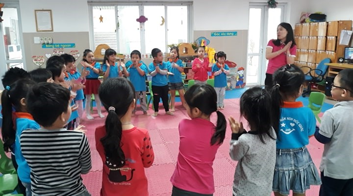 Âm nhạc là phương tiện phát triển năng lực thẩm mỹ, đạo đức, trí tuệ, thể chất cho trẻ, tạo tiền đề cho sự phát triển toàn diện nhân cách. Với vai trò như vậy, âm nhạc đã trở thành một nội dung cần thiết trong chương trình giáo dục mầm non, trong đó hoạt động dạy trẻ vận động đóng vai trò quan trọng. Trong nhiều cách vận động, hôm nay cô và trò lớp MGL A6 đã chọn cách vỗ tay theo tiết tấu chậm cho bài hát” em đi chơi thuyền”, các bạn nhỏ đều hào hứng khi được vỗ tay theo tiết tấu có sử dụng dụng cụ gõ đệm: xắc xô, mõ dừa, phách tre…