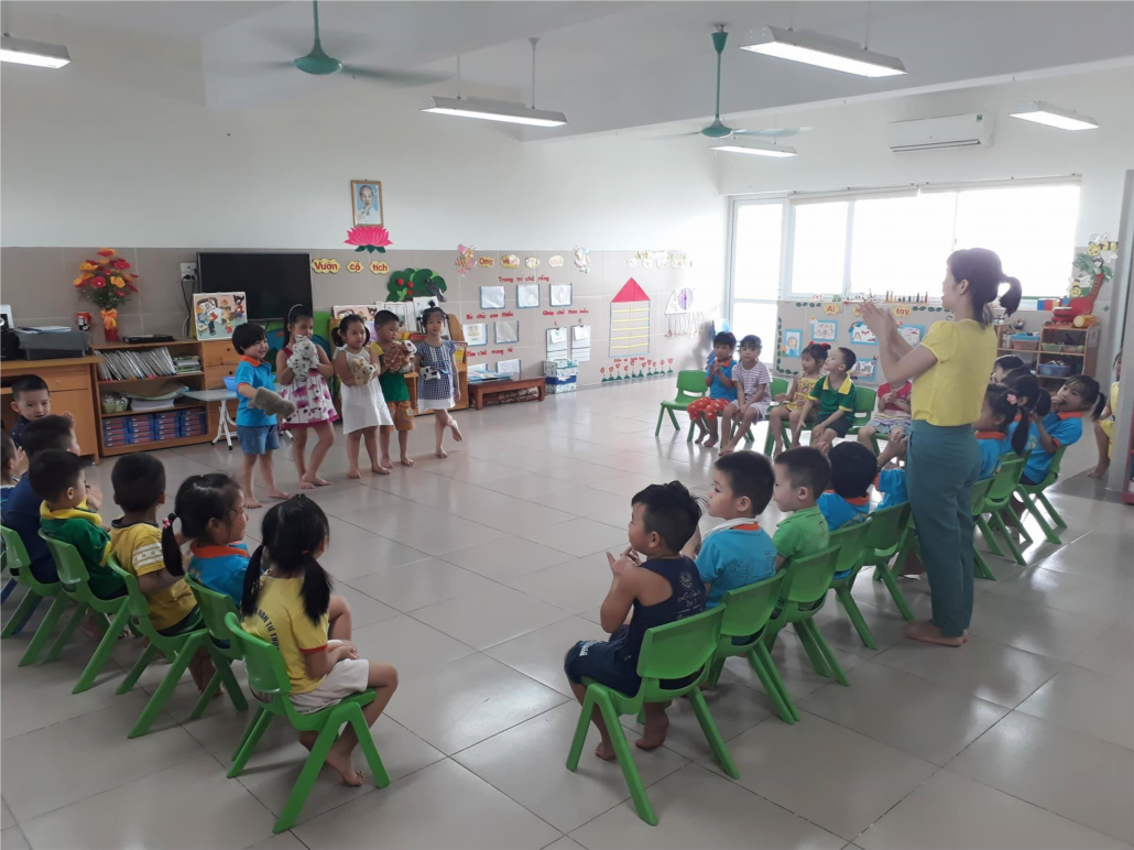 Trong mỗi tiết học lớp A6 luôn tạo hứng thú lôi cuốn trẻ bằng các phương pháp dạy học sáng tạo, tổ chức tiết học linh hoạt. Ví dụ cho trẻ kể truyện, đọc thơ, sáng tạo với những con rối ngộ nghĩnh.