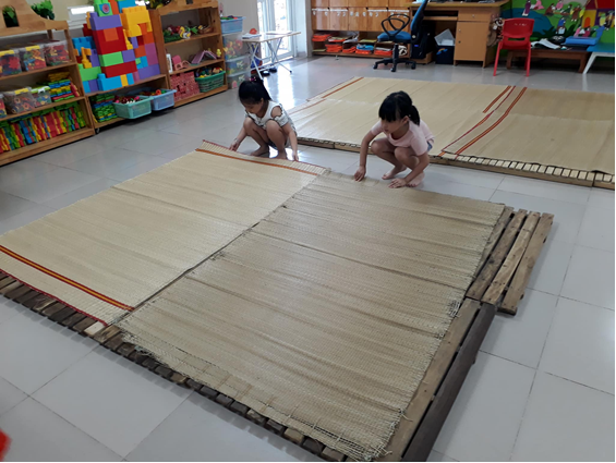 Cô hướng dẫn trẻ tự làm 1 số việc vừa với sức như: cất gối, xếp chăn, chiếu cùng cô giáo.