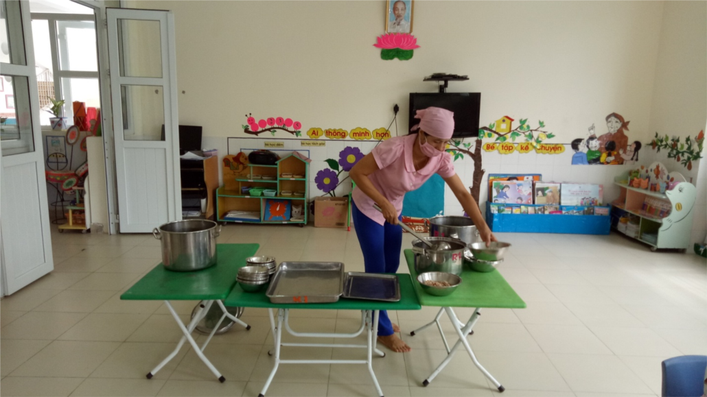 Cô chia thức ăn mặn thành 3 bát to, mỗi 1 bát thức ăn tương đương với 7 trẻ ăn.