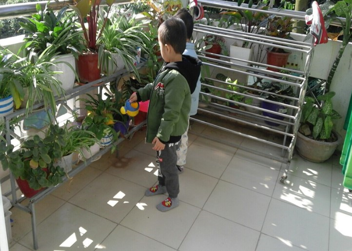 Trẻ tưới cây và lau lá cây tại góc thiên nhiên