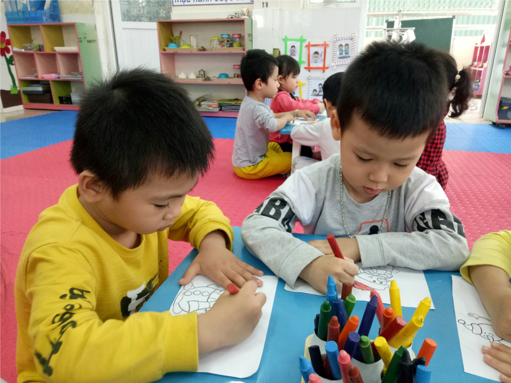 Qua hoạt động tô màu tranh theo chủ đề, các bạn lớp MGN B1 có cơ hội luyện tập kỹ năng vận động tinh để phát triển khả năng phối hợp vận động và rèn luyện các cơ nhỏ ở tay. Tập vẽ và tô màu là một cách để trẻ phát triển kỹ năng vận động tinh mà sau này trẻ sẽ cần đến khi học viết. Kỹ năng vận động tinh là khả năng điều khiển và phối hợp các cử động của bàn tay để hoàn thành các công việc như viết chữ, buộc dây giày hoặc dùng đũa hoặc dĩa để ăn.