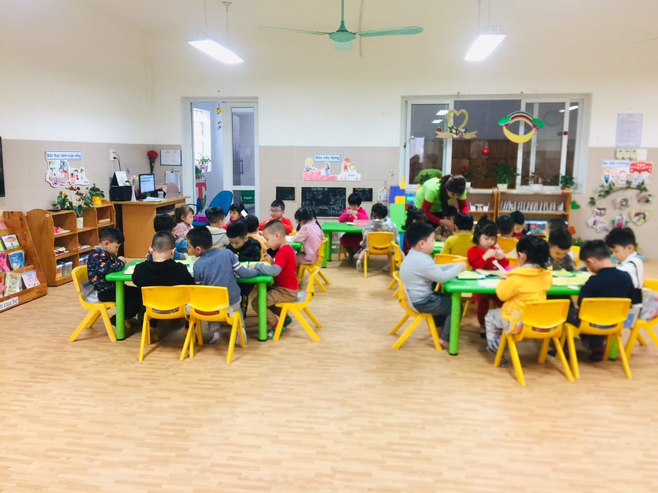 Cô bao quát hướng dẫn trẻ trang trí hoa đào