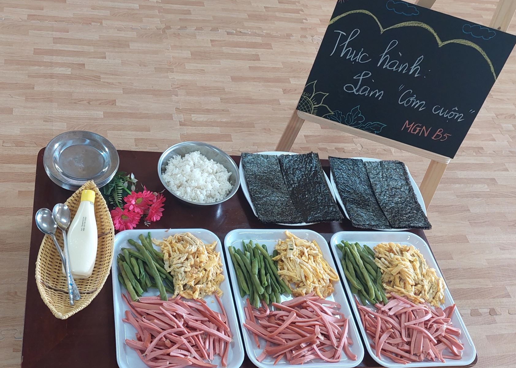 👉Với các nguyên liệu được cô chuẩn bị đảm bảo sạch sẽ, vệ sinh như: Lá rong biển, cơm, trứng rán, xúc xích, đỗ xanh và sốt mayonnaise. Dưới sự hướng dẫn của các cô, đôi bàn tay bé nhỏ của bé đã tự mình làm ra những cuốn cơm màu sắc và đầy đủ chất dinh dưỡng. Các bé đều thích thú khi tự mình được trải nghiệm và thưởng thức món "cơm cuộn” rất ngon lành.