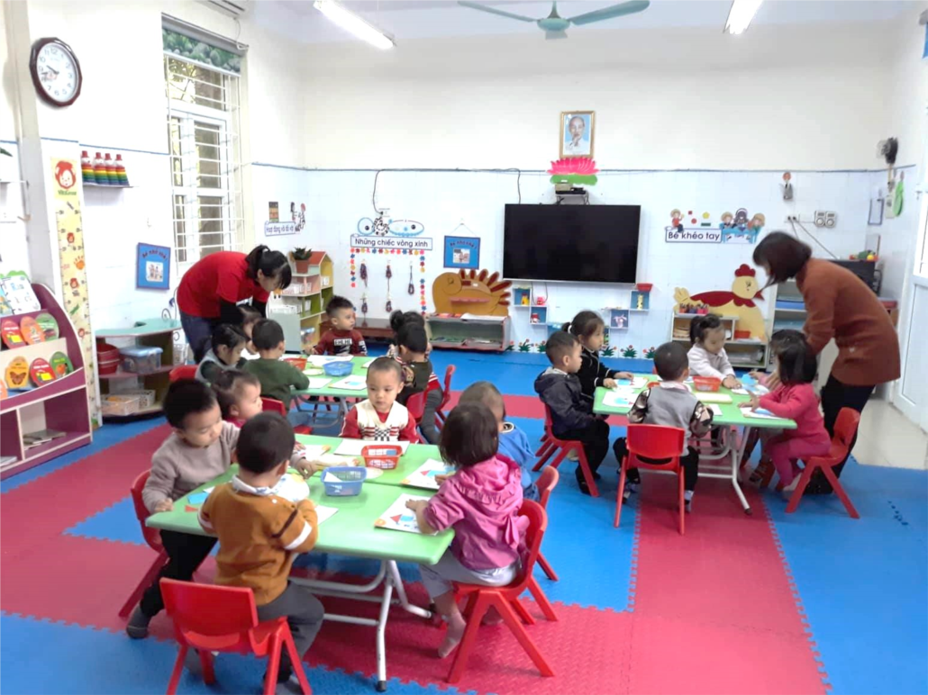 Trẻ mầm non luôn rất nhạy cảm với cái đẹp xung quanh, đây là thời kỳ phát triển những cảm xúc thẩm mỹ. Đó là những cảm xúc tích cực được nảy sinh khi trẻ tiếp xúc trực tiếp với cái đẹp trong các nghệ thuật trong đó có nghệ thuật tạo hình. Hoạt động tạo hình có vai trò rất lớn đối với sự nhận thức cho trẻ. Thông qua hoạt động tạo hình, trẻ có cơ hội tìm hiểu, nghiên cứu các đối tượng miêu tả để có được hiểu biết, hình dung về đối tượng đó, từ đó trẻ xây dựng các đối tượng. Hoạt động tạo hình là phương tiện để phát triển tư duy, trí nhớ, tưởng tượng… điều đó giúp tăng thêm vốn hiểu biết của trẻ. Thông qua hoạt động tạo hình giúp trẻ nhận ra màu sắc, hình dạng, đường nét, sự sắp xếp trong không gian…nhận thấy được cái đặc trưng và nét đẹp trong sự vật, hiện tượng mà trẻ miêu tả. Hoạt động tạo hình giúp cho đôi bàn tay của trẻ linh hoạt, phát triển khả năng kết hợp khéo léo của đôi tay và đôi mắt.Vậy nên các cô giáo lớp nhà trẻ D1 luôn tạo môi trường kích thích tính tò mò, ham hiểu biết, luôn tạo ra cái đẹp cho trẻ tham gia một cách tích cực nhất.