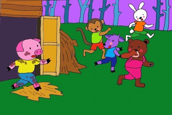 Lợn con vừa lười vừa bẩn, không thích tắm, suốt ngày chỉ nhắm mắt nằm. Hôm đó, lợn ta tỉnh giấc trong tiếng cười đùa huyên náo của các con vật khác. Hé mắt nhìn qua cửa sổ, lợn con thấy bạn bè đang chơi đùa thỏa thích. Lợn ta vội vàng chạy đến dưới gốc cây. Ai dè, các con vật thấy lợn con vội vàng bịt mũi chạy tản ra chỗ khác. Chúng vừa chạy vừa la toáng lên "Hôi, hôi, hôi quá". Chỉ trong nháy mắt tất cả các con vật biến mất tăm mất tích. Lợn con ngạc nhiên quá. "Sao vậy?". Một con chim tốt bụng sà qua bảo cho lợn con biết: "Lợn con ơi, lợn con ơi! Cậu bẩn quá, đi tắm đi, nhanh lên!". Lợn con vội chạy về nhà tắm gội. Nay lợn con sạch sẽ lắm rồi. Các bạn lại đồng ý chơi với nó rồi đấy!