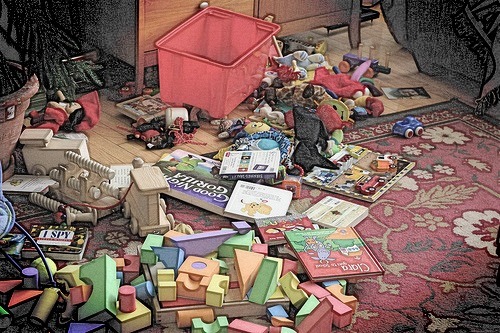 Sau khi mẹ đi chợ, Đông và mèo con cùng đùa nghịch ở trong phòng. Đông lấy cái đàn oóc gan mẹ mua cho ra chơi. Nhưng chưa đầy mười phút sau, Đông lại bỏ cây đàn sang một bên và lấy tàu hỏa ra chơi, năm phút sau Đông bỏ tàu hỏa và quay ra cắt giấy Đông cắt giấy không gom vào một chỗ mà để vương vãi khắp phòng. Cứ như vậy Đông lôi hết món đồ chơi này lại đến món đồ chơi khác ra chơi. Chơi chán Đông lại bày ra khắp phòng. Căn phòng chẳng mấy chốc trở nên vô cùng bừa bộn không còn lối nào để đi lại.