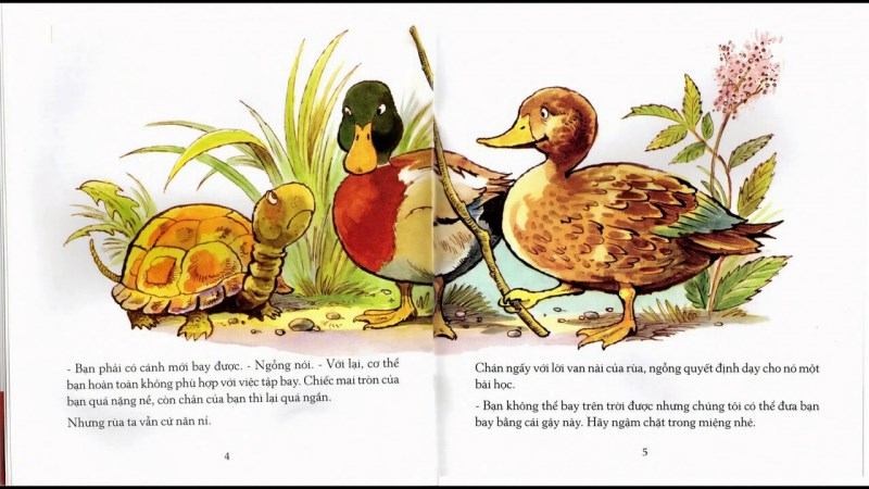 ***Hai vợ chồng ngỗng và rùa là những người bạn tốt. Mùa hè đến, trời bắt đầu nóng lên khiến hồ nước dần cạn kiệt. Vì vậy, chúng lên kế hoạch đi tìm một chỗ ở mới. Tuy nhiên, rùa không thể bay được nên ngỗng quyết định mang rùa theo bằng cách vợ chồng ngỗng cùng ngậm một cái cây bay hai bên, ở giữa chú rùa cũng ngậm cái cây đó. Điều duy nhất mà rùa cần phải nhớ là không được mở miệng ra khi bay.