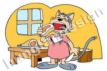 Chó nghe vậy liền đi ngay. Ở nhà, Mèo khoái chí cắt bớt một khoanh giò to tướng cho vào miệng.