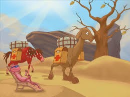 Lạc Đà chẳng nói gì, lặng lẽ chuẩn bị uống nước, ăn cỏ rồi chở mấy kiện thuốc lên đuờng. Nó đi trong sa mạc, từng bước vững vàng, mặt trời chiếu rọi những tia nắng nóng như lửa. Ngựa Đỏ mồ hôi dầm dề, vừa khát vừa đói, còn Lạc Đà càng đi càng khỏe. Lạc Đà nói: