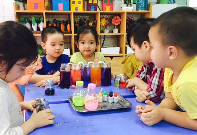 – Cho trẻ chia làm 2 nhóm, mỗi nhóm tự chọn vị trí xếp thẻ nhựa khác với lúc đầu. Rồi mỗi nhóm sẽ đổ thứ tự các lớp chất lỏng theo như đã chọn và mang ly chất lỏng vừa đổ lên cùng quan sát xem các lớp chất lỏng có đứng ở đúng vị trí đó không?