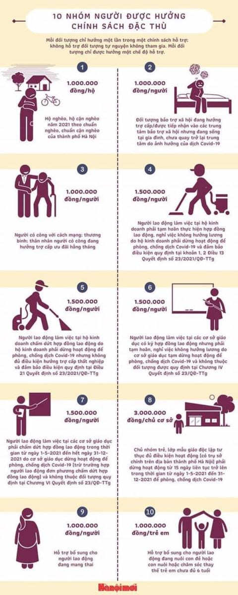 UBND TP Hà Nội ban hành chính sách đặc thù của Hà Nội hỗ trợ 10 nhóm đối tượng bị ảnh hưởng, gặp khó khăn do đại dịch Covid-19 chưa được quy định tại Nghị quyết số 68/NQ-CP của Chính phủ; đồng thời, TP Hà Nội cũng bổ sung 500 tỷ đồng để người lao động và người sử dụng lao động được vay vốn phục hồi kinh tế.