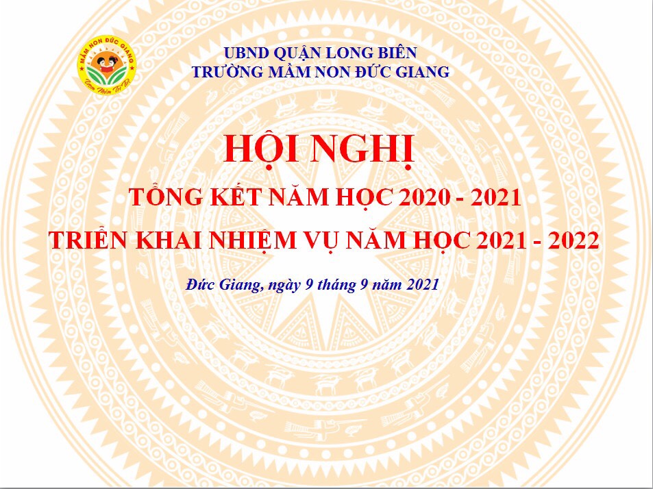 Trong tình hình dịch bệnh Covid-19 đang diễn biến phức tạp, 08h 00 sáng ngày 09/9/2021, trường Mầm non Đức Giang tổ chức Hội nghị theo hình thức trực tuyến với sự tham gia của 100% CBGVNV nhà trường. Qua đó bà Nguyễn Thị Lan Anh - Hiệu trưởng nhà trường và các đ/c trong Ban giám hiệu báo cáo tổng kết năm học cũ và triển khai tới giáo viên, nhân viên các nhiệm vụ cụ thể chuẩn bị cho năm học mới.
